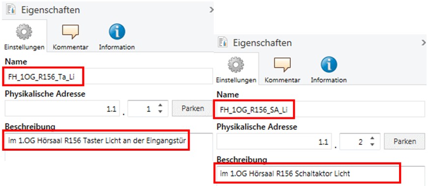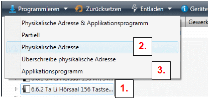 Markieren Sie der Reihe nach die Geräte und programmieren Sie zuerst die physikalische Adresse und anschließend die Applikation (Anwendung).