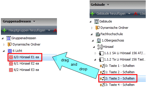 Per „drag and drop“ (mit der linken Maustaste auf das Objekt drücken, Maustaste gedrückt halten, auf die Gruppenadresse ziehen und Maustaste loslassen) wird dann das erste Kommunikationsobjekt mit der zugehörigen Gruppenadresse verknüpft.