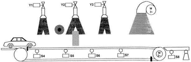 Durch Betätigung des Starttasters „S3“ schaltet der Bandantriebsmotor ein. Durch das nun laufende Transportband werden nacheinander die Grenztaster „S4“ bis „S8“ betätigt.