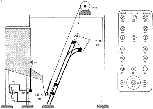 Ein Kübel soll Material aus dem Vorratsbunker auf ein Förderband transportieren. Die Anlage soll im Hand- und Automatikbetrieb fahrbar sein. Für beide Betriebsarten gelten folgende Schaltbedingungen: