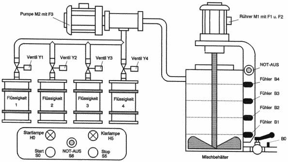 Die Bedienperson betätigt den Starttaster S0. Die Startlampe leuchtet, Pumpe M2 und Rührer M1 werden eingeschaltet. Ventil Y1 öffnet und die Flüssigkeit 1 wird in den Mischbehälter gepumpt, bis der Fühler B1 erreicht wird.